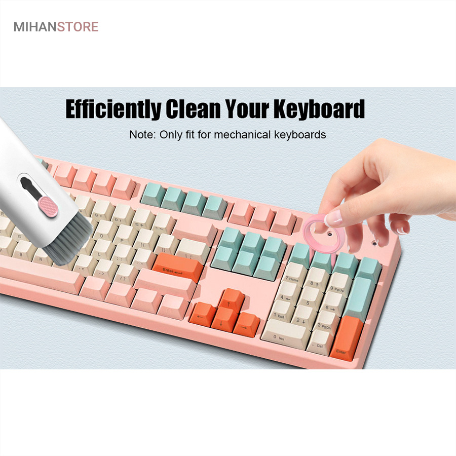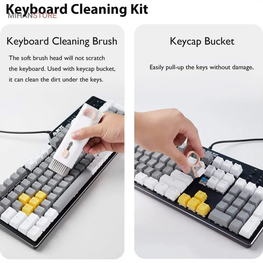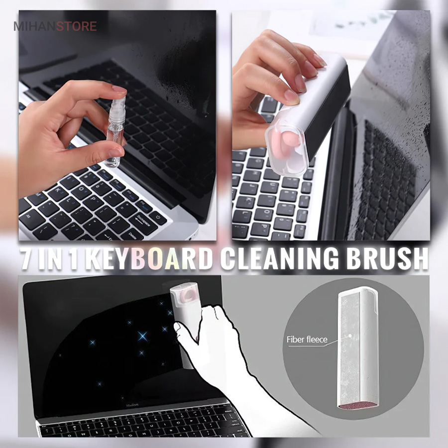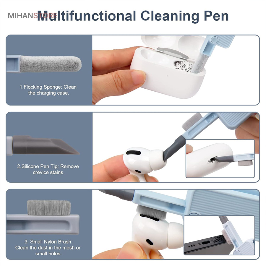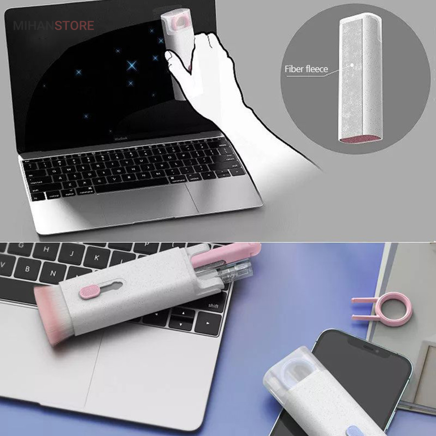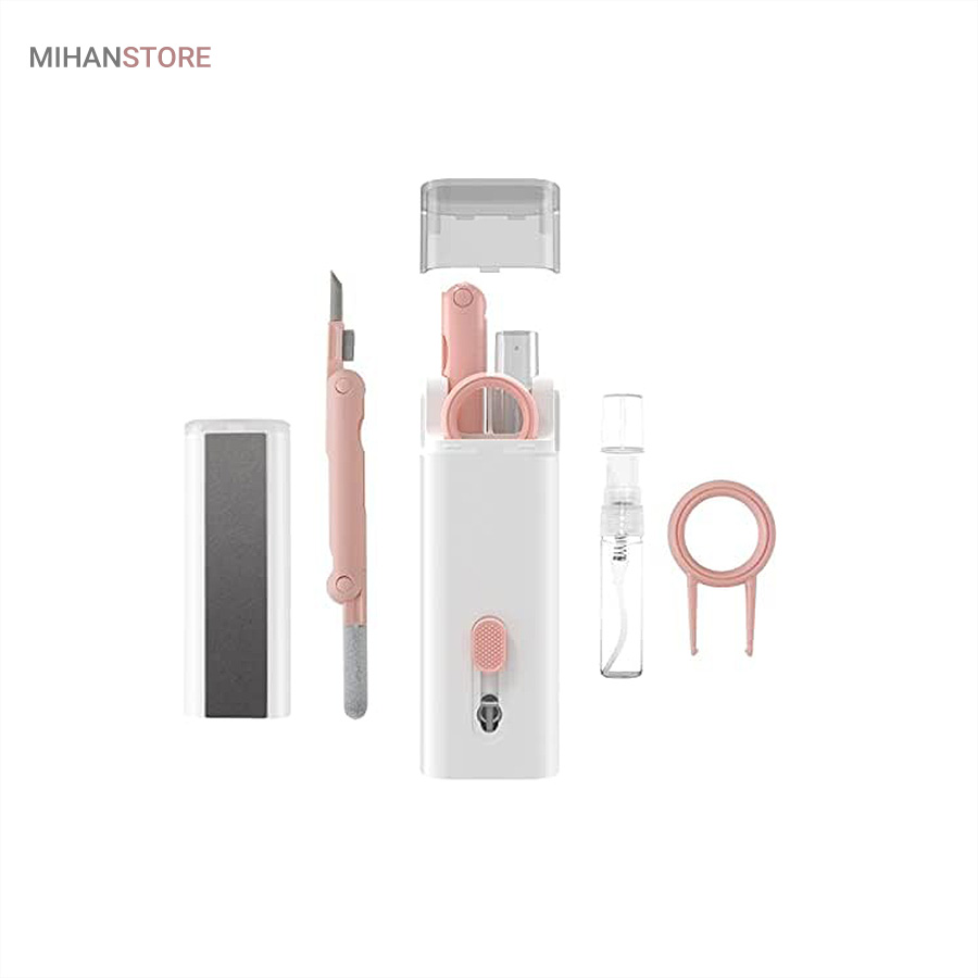 این کیت تمیزکننده 7 کاره شامل 1 برس بزرگ با تراکم بالا، 1 عدد پد تمیز کننده فیبری (مخصوص سطوح مانند مانیتور) ، 1 قلم تمیز کننده گوشی (شامل نوک فلزی، اسفنج و مینی برس با چگالی بالا)، 1 عدد کلیدکش کیبورد و 1 بطری اسپری می باشد. این سرویس پاک کننده چند منظوره می تواند هر خواسته شما را برای تمیز کردن وسایل الکترونیکی برآورده کند. اولین ابزار یک خودکار تمیزکننده تاشو با نوک سیلیکونی، برس کوچک سخت و اسفنج جمعکننده کثیفی ها ، مناسب برای تمیز کردن ایرپاد و سایر هدفونها یا هندزفری ها. نوک سیلیکونی برای تمیز کردن لکه های شکاف است. دومین ابزار برس کوچک برای تمیز کردن گرد و غبار سطوح عمیق و اسفنج دسته دار برای تمیز کردن حفره های کیس شارژ ایرپاد ها میباشد. ابزار سوم تمیز کننده لپ تاپ، رایانه، تبلت و صفحه کلید می باشد کافیست برس نرم بزرگ را بکشید تا گرد و غبار روی رایانه، لپ تاپ، تبلت و صفحه کلید پاک شود. و همچنین می توانید از کلیدکش کیبورد جدا کردن کلیدهای صفحه کلید مکانیکی برای انجام این کار استفاده کنید. ابزار بعدی تمیز کننده مانیتور، صفحه نمایش، دوربین، ساعت و تلویزیون میباشد: در کنار یک بطری خالی اسپری 5 میلیلیتری، مایع تمیزکننده یا آب را درون بطری قرار میدهید و از صفحه فیبری برای تمیز کردن صفحههای مختلف استفاده میکنید. به عنوان مثال صفحات نمایش ، تلویزیون، ساعت، دوربین و غیره.اندازه جمع و جور و سبک وزن: 7 ابزار تمیز کردن کامپیوتر به طور مرتب در یک جعبه مستطیلی قرار گرفته اند. اندازه کیت پاک کننده فقط 4.88 * 1.73 * 1.18 اینچ و وزن آن تقریبا 80 گرم است. برای سفر به اندازه کافی کوچک است و می توانید آن را حمل کنید. در همین حال، شما همچنین می توانید هر ابزار تمیز کننده ای را به طور جداگانه بیرون بیاورید.